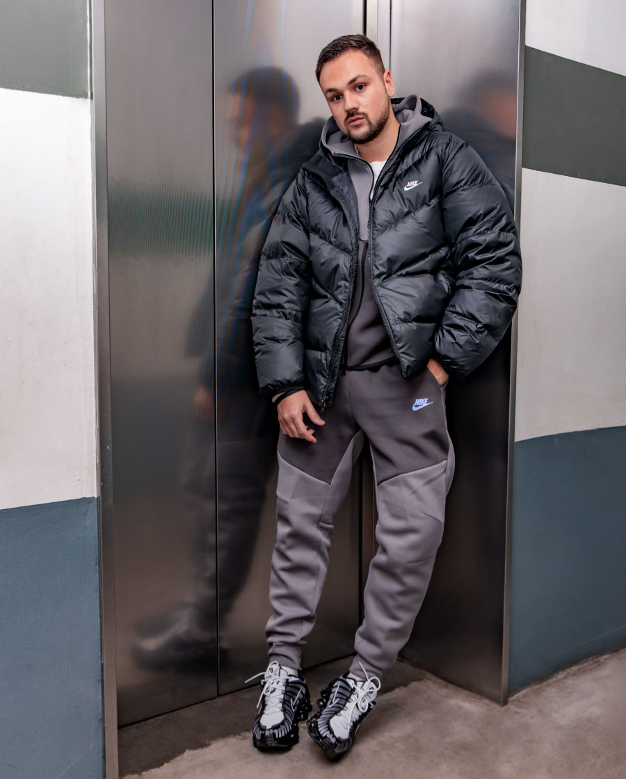 Kombinovao sam ih sa jednim od najviralnijih komada sezone, Nike Tech Fleece trenerkom, ali sam izbegao klasičnu kombinaciju. Izabrao sam crnu bazu sa tamnosivim i suptilnim plavim detaljima, da outfit ostane clean, ali da ne izgubi karakter. Kada temperature padnu, jakna je obavezan deo priče. Crna Nike jakna je tu da zaokruži ceo look i doda onaj finalni street touch.
