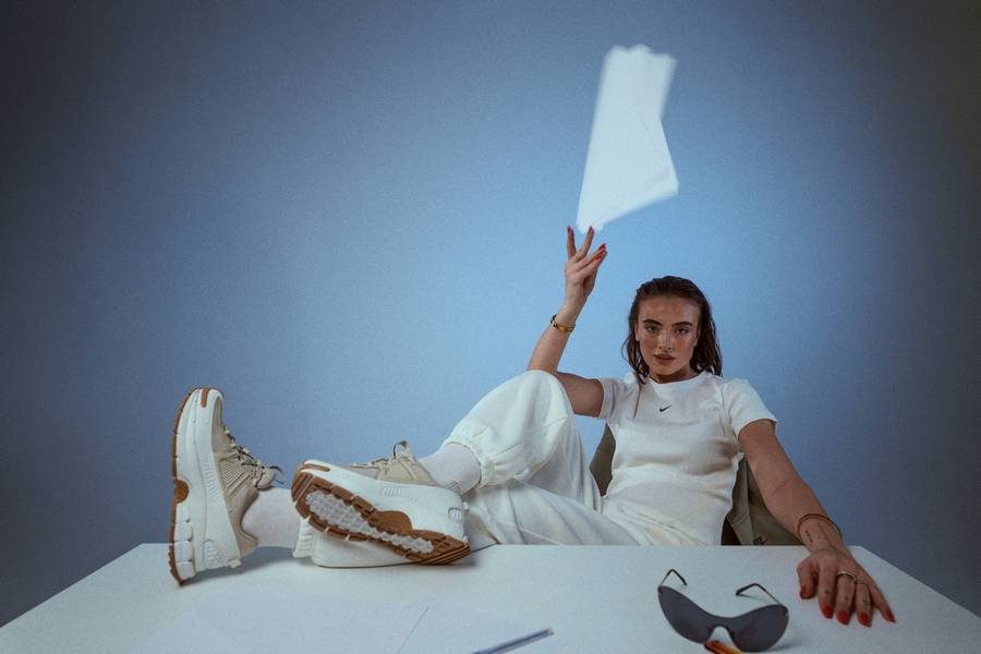 Studio nam je dao slobodu da se igramo pozama, svetlom i pokretom. Mali sto nije bio samo rekvizit, već kontrast — spoj radne atmosfere i modne energije. Tu NIKE ZOOM VOMERO ROAM pokazuju koliko su prilagodljive: od dinamičnog dana u pokretu do savršeno stilizovanog outfita, bez gubitka karaktera.