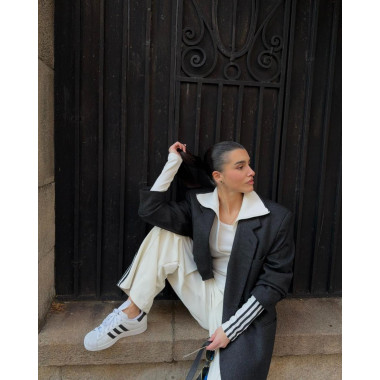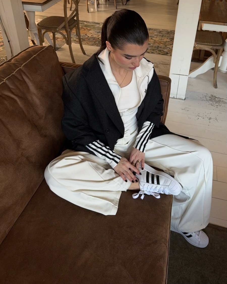 Volim kada je outfit čist. Bela i crna. Jasne linije. Kontrast koji ne mora da se objašnjava. Zato sam ih kombinovala sa širokim pantalonama i oversized blejzerom. Sport × struktura. Street × polish. Taj balans mi je bitan. SuperStar su deo tog balansa.